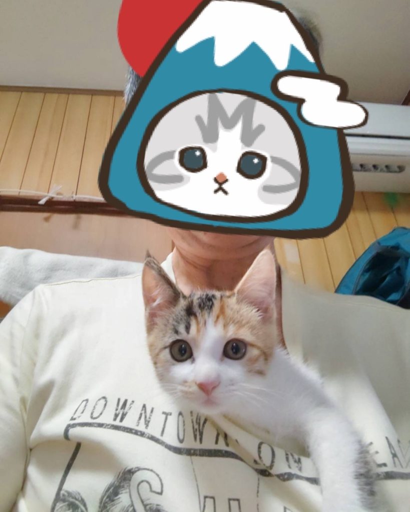 保護者さんのTシャツの襟もとからひょっこり、カメラ目線の小夏ちゃん 大きくなりました